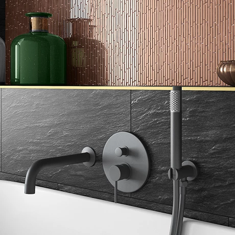The contemporary Arezzo matt black wall mounted concealed manual valve with built-in diverter, bath spout and shower handset. Create a modern clean feel in your bathroom with this minimalist styled luxury wall mounted shower valve package.