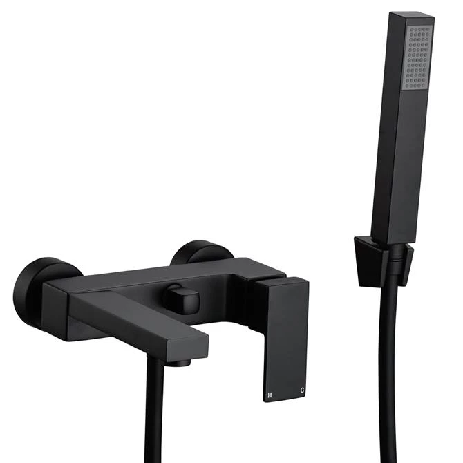 Choose this Arezzo Square Matt Black Wall Mounted Bath Shower Mixer Tap to complete the look of your contemporary bathroom. Crafted from brass, this high quality bath mixer tap will withstand the rigours of daily use. It features smart rounded shrouds for elegant wall mounting. The single lever tap is easy to operate, providing practical control over flow and temperature. Divert water between bath spout and handheld shower head quickly and easily thanks to the handy central knob. The eye catching finish of this matt black mixer tap gives it a designer feel that will complement other bathroom fittings beautifully. Includes a matching shower kit consisting of a rectangular handheld shower head, wall bracket and flexible hose.