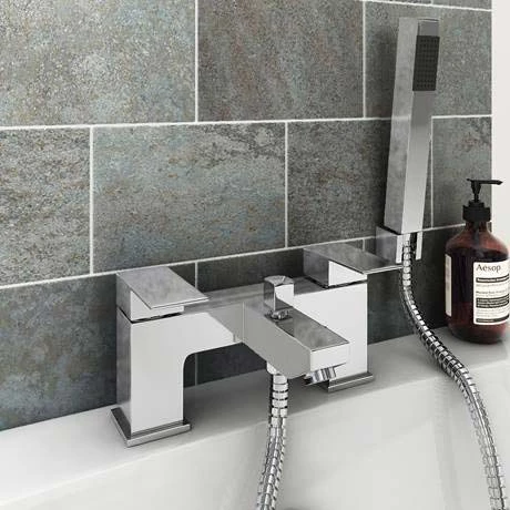 The designer contemporary style Cast bath shower mixer tap combines a square body with an angular spout and matching levers, would be suitable for any modern bathroom. Includes the handheld shower head, wall bracket and the flexible hose.