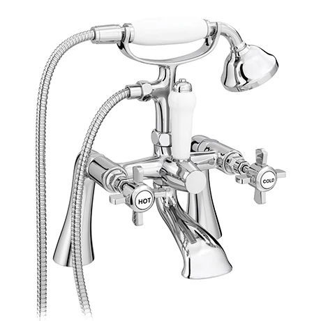 These Regent Traditional Bath Shower Mixer Taps are inspired by Victorian and Edwardian designs for a traditional feel. While they have an antique look, they’re manufactured to today’s high standards, with brass bodies and ceramic handles for durability. This chrome mixer tap is 320mm tall, with a polished plated finish that gives a contemporary sparkle. It’s easy to install and can quickly divert water to a handheld hose for flexible use. Whether you’re looking to replace a worn out tap or redesign the whole room, this bath mixer tap looks at home on a single ended bath.
